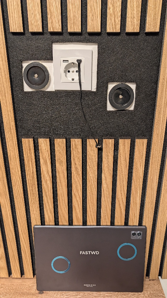 In addition, it should be integrated into an acoustic panel. So, I cut out the existing supports, cut holes in the felt, installed a power outlet with a USB power adapter, glued two magnetic rings to the back, and screwed the counterparts to the wall.