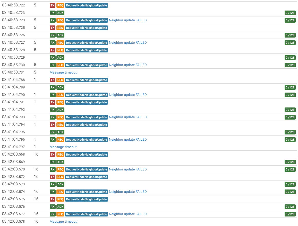 I’ve had DEBUG level logging on the zwave binding for the past few days. Looking through the logs using @chris’s log viewer, I see a lot of “Neighbor update failed” and “message timeout” messages.