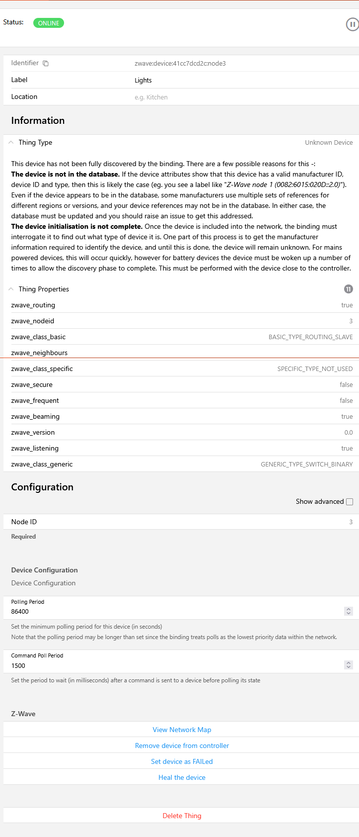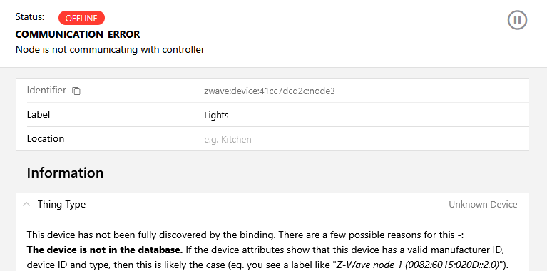 2026-01-01 18:57:56.081 \[INFO \] \[ab.event.ThingStatusInfoChangedEvent\] - Thing âzwave:device:41cc7dcd2c:node7â changed from ONLINE: Node initialising: PING to OFFLINE (COMMUNICATION_ERROR): Node is not communicating with controller