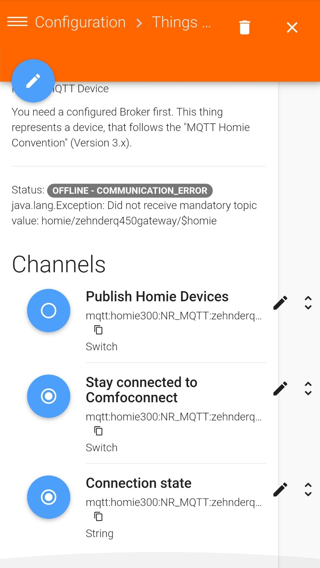 Status: OFFLINE - COMMUNICATION_ERROR java.lang.Exception: Did not receive mandatory topic value: homie/zehnderq450gateway/$homie