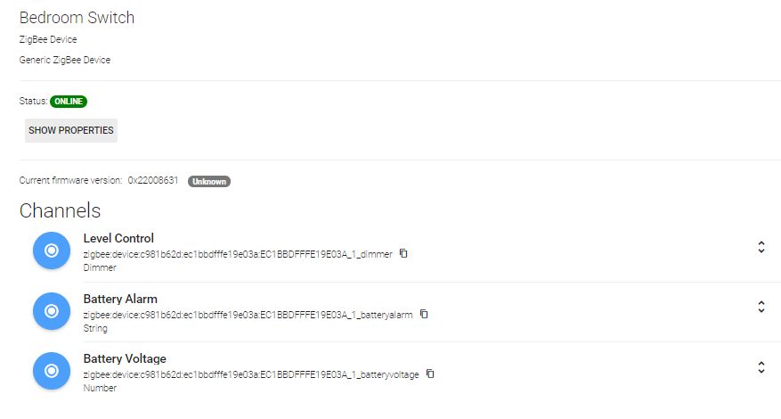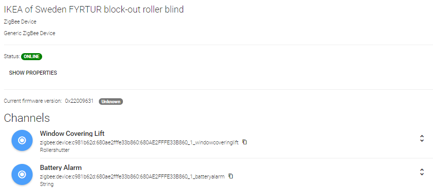 Early on, after many tries, I finally got the blind connected to the coordinator, it appeared as an end device, but the Thing failed as there were essentially no clusters available (if I recall right). Basically it’s a dumb end_device that needs to be connected to the router. No channels there. So that didn’t do me any good.