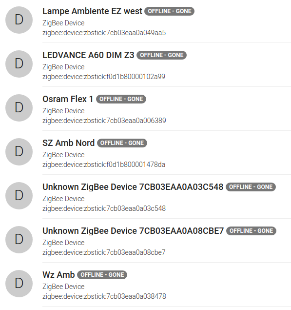 2020-09-09 16:50:43.791 [DEBUG] [ng.zigbee.handler.ZigBeeThingHandler] - F0D1B800001478DA: Coordinator is unknown or not online.