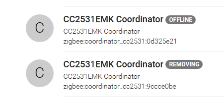 After much of testing i now ended up with 1 coordinator that is in REMOVING that never vanishes (even after reboot) and another one that is OFFLINE but set correctly…