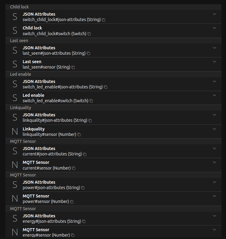 homeassistant/sensor/0x086bd7fffeee22c2/energy/config {"availability":[{"topic":"s01/bridge/state"},{"topic":"s01/PlugDummy/availability"}],"availability_mode":"all","device":{"identifiers":["zigbee2mqtt_0x086bd7fffeee22c2"],"manufacturer":"Niko","model":"Connected socket outlet (170-33505/170-34605)","name":"PlugDummy","sw_version":"313-286-00","via_device":"zigbee2mqtt_bridge_0x00124b001ca1b25e"},"device_class":"energy","enabled_by_default":true,"json_attributes_topic":"s01/PlugDummy","object_id":"PlugDummy_energy","origin":{"name":"Zigbee2MQTT","sw":"1.42.0","url":"https://www.zigbee2mqtt.io"},"state_class":"total_increasing","state_topic":"s01/PlugBathroomGirl ","unique_id":"0x086bd7fffeee22c2_energy_s01","unit_of_measurement":"kWh","value_template":"{{ value_json.energy }}"}