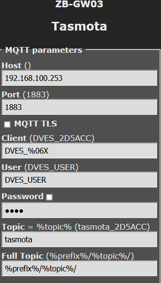 Tasmota ZB-GW03 is paired with one Zigbee device and MQTT settings is (192.168.100.253 is OpenHAB and Mosquitto server):