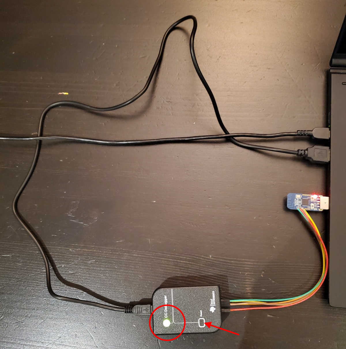Now you have the CC Debugger and the USB stick connected to each other, you then need to connect both to your computer to power them. The CC Debugger has a LED that may initially be red, but you can press its Reset button and if all your connections are properly in place the light will turn green:
