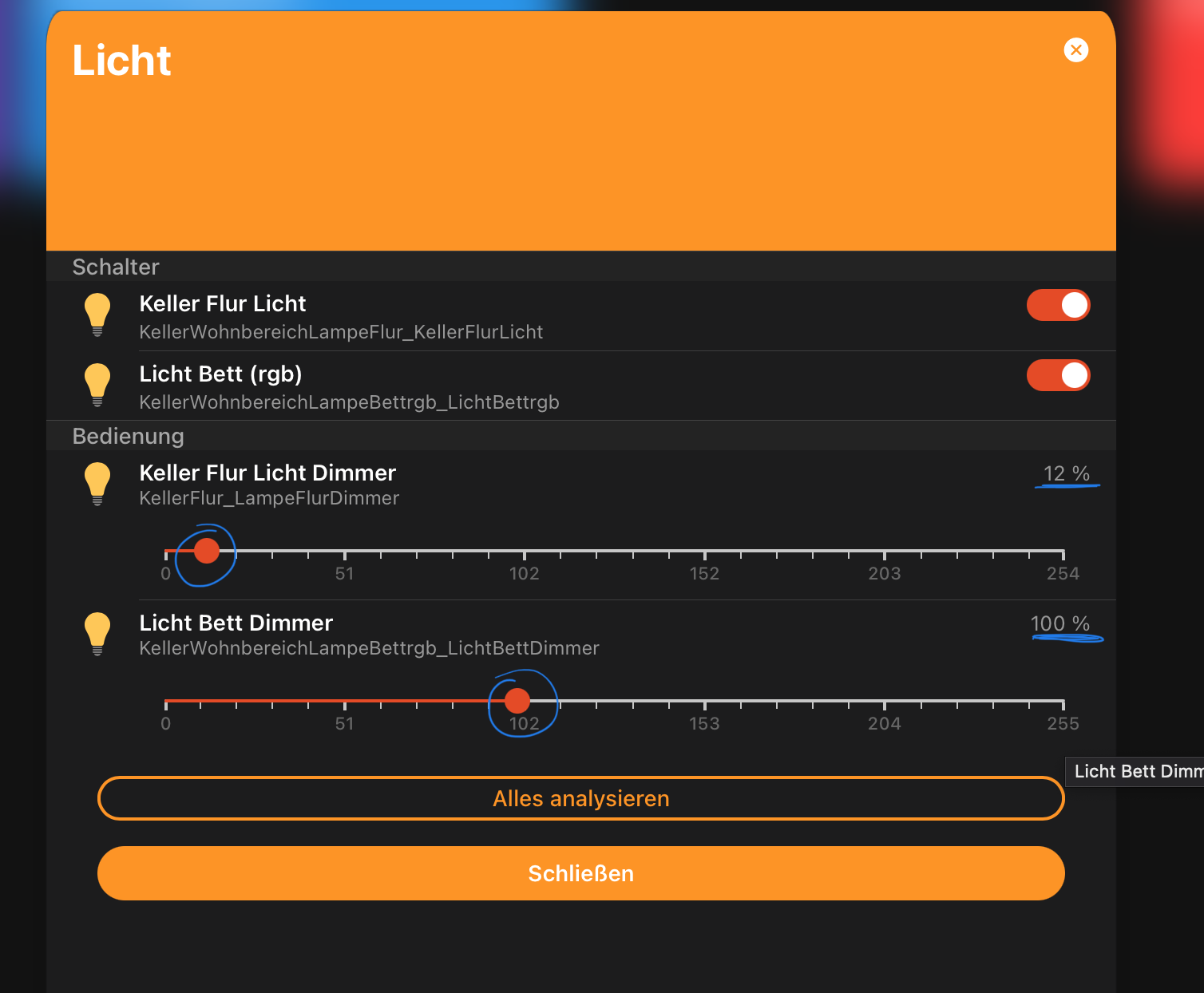 For Some reasons the control elements sometimes show the value of the dimmer in percentage and sometimes in absolut numbers between 0 and 254. I added a screenshot of both of them being mixed and therefore creating a lot of problems and leading to the result that no command is sent at all at some point.