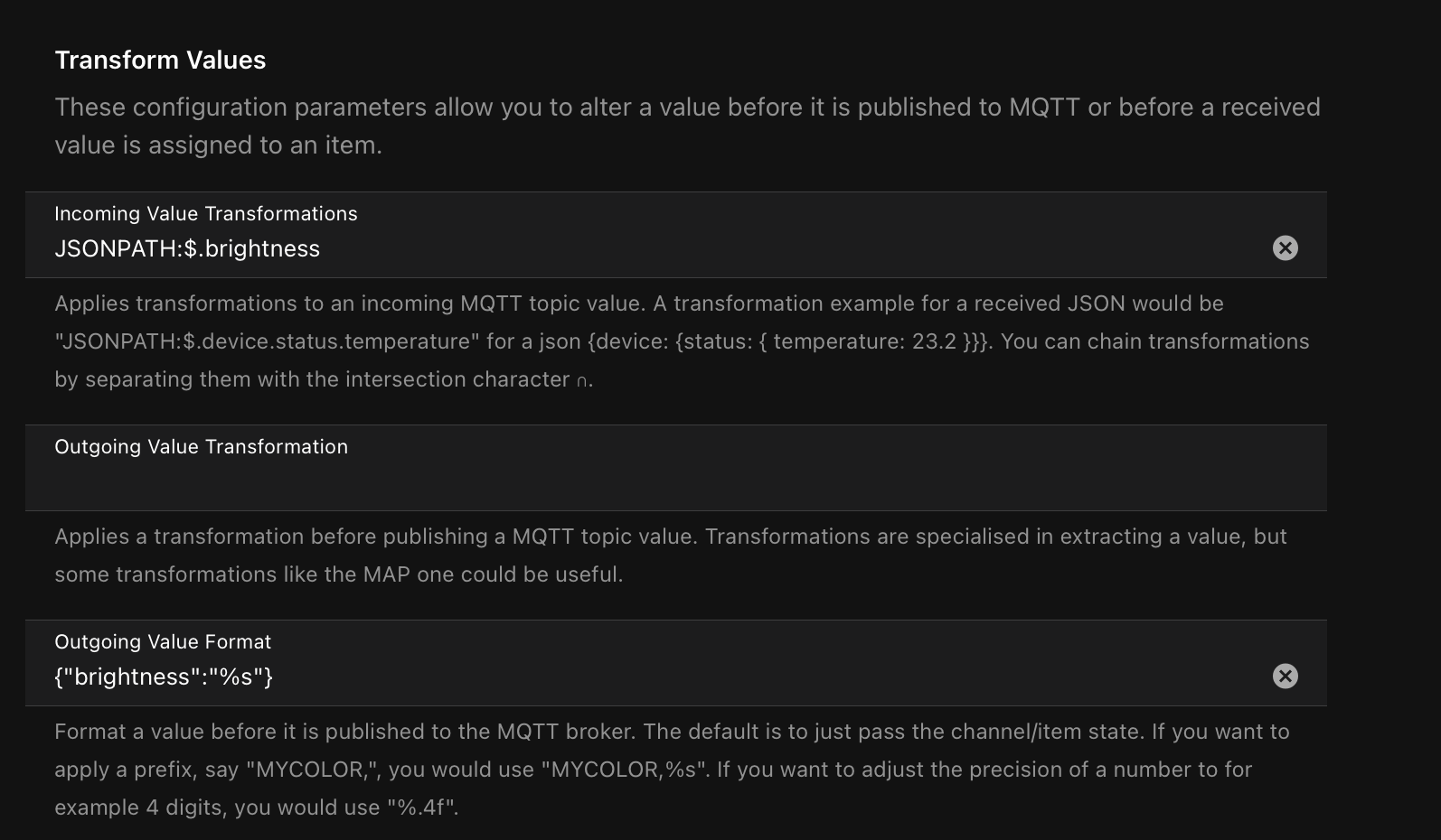 the real problems begin when I create an generic MQTT Thing for controlling the brightness of my lightbulbs. These take values between 0 and 254 and I created a channel with a percentage value and set the min and max value to 0 and 254.