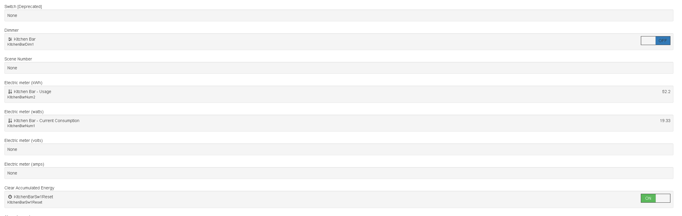 Number KitchenBarNum1 "Kitchen Bar - Current Consumption [%.1f W]" (gAllLightsUsage,gEnergyRealTime,PubItems_UPD) { channel="zwave:device:12c97eda:node5:meter_watts" }