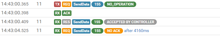 13:55:43.867 [DEBUG] [ol.serialmessage.SendDataMessageClass] - NODE 5: SendData Request. CallBack ID = 21, Status = Transmission complete and ACK received(0)