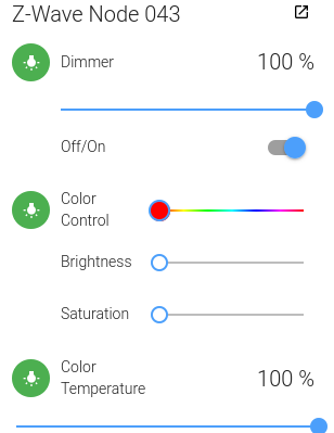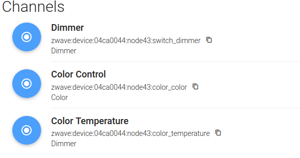 I can control the Dimmer and Color Temperature channels, it’s working OK. But When I try to use the color control, the color does not change. The light just switch off, here are my channels (I don’t know where is the conf file since I used only PaperUi for the moment. )